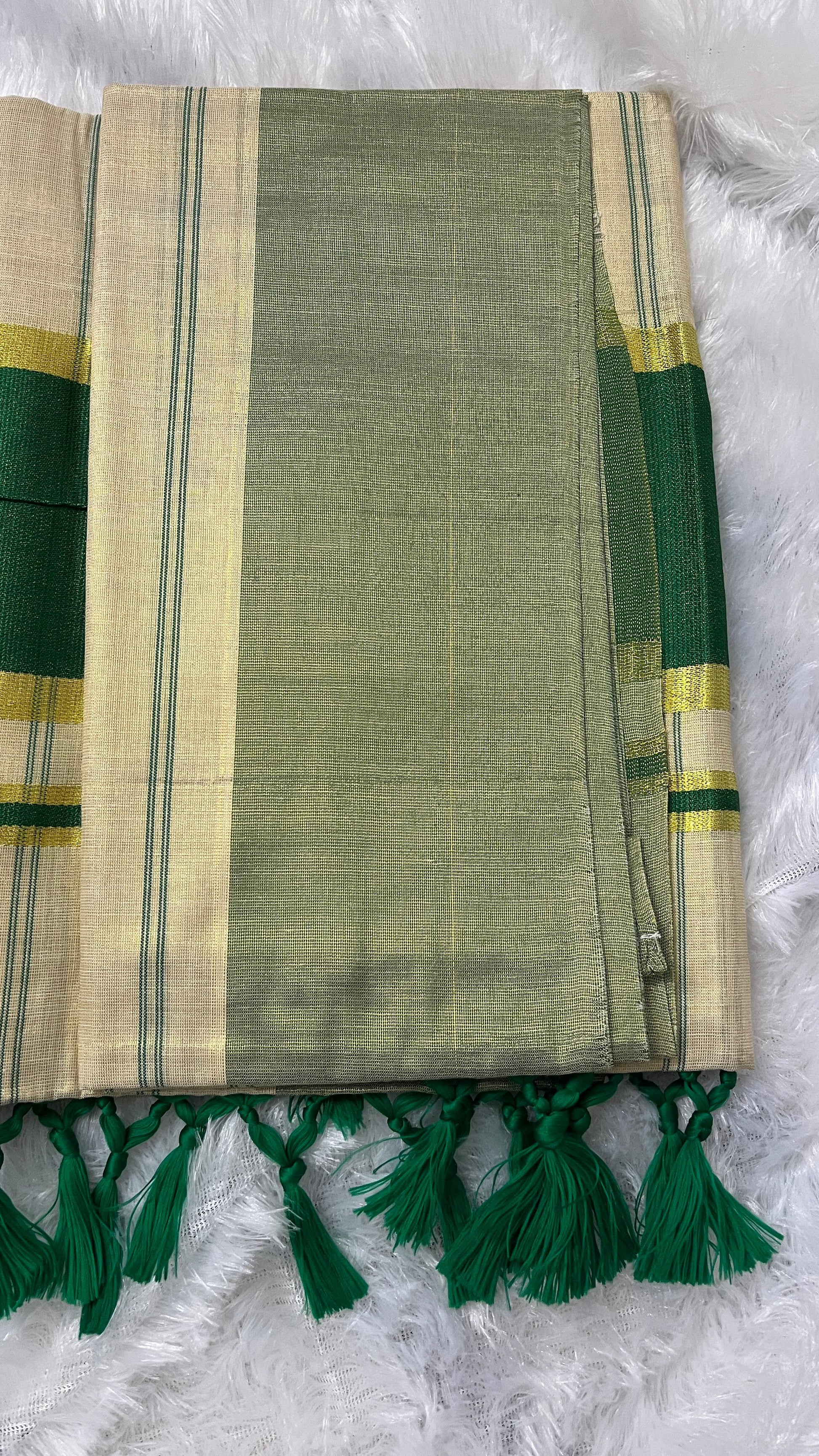 The saree features a lustrous golden tissue body with rich green kasavu borders, reflecting the elegance of leaves and the beauty of tradition.