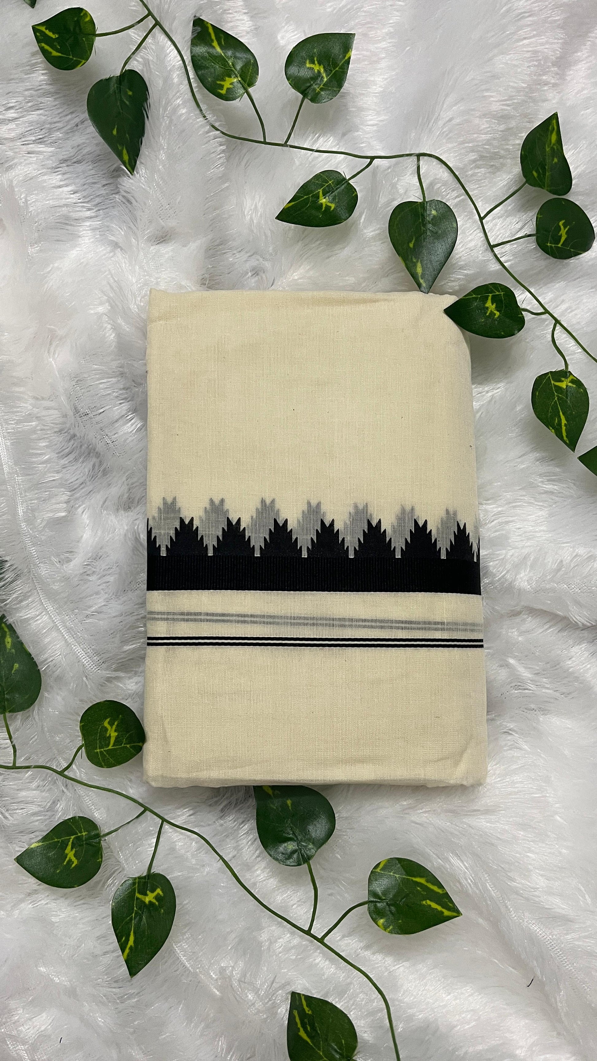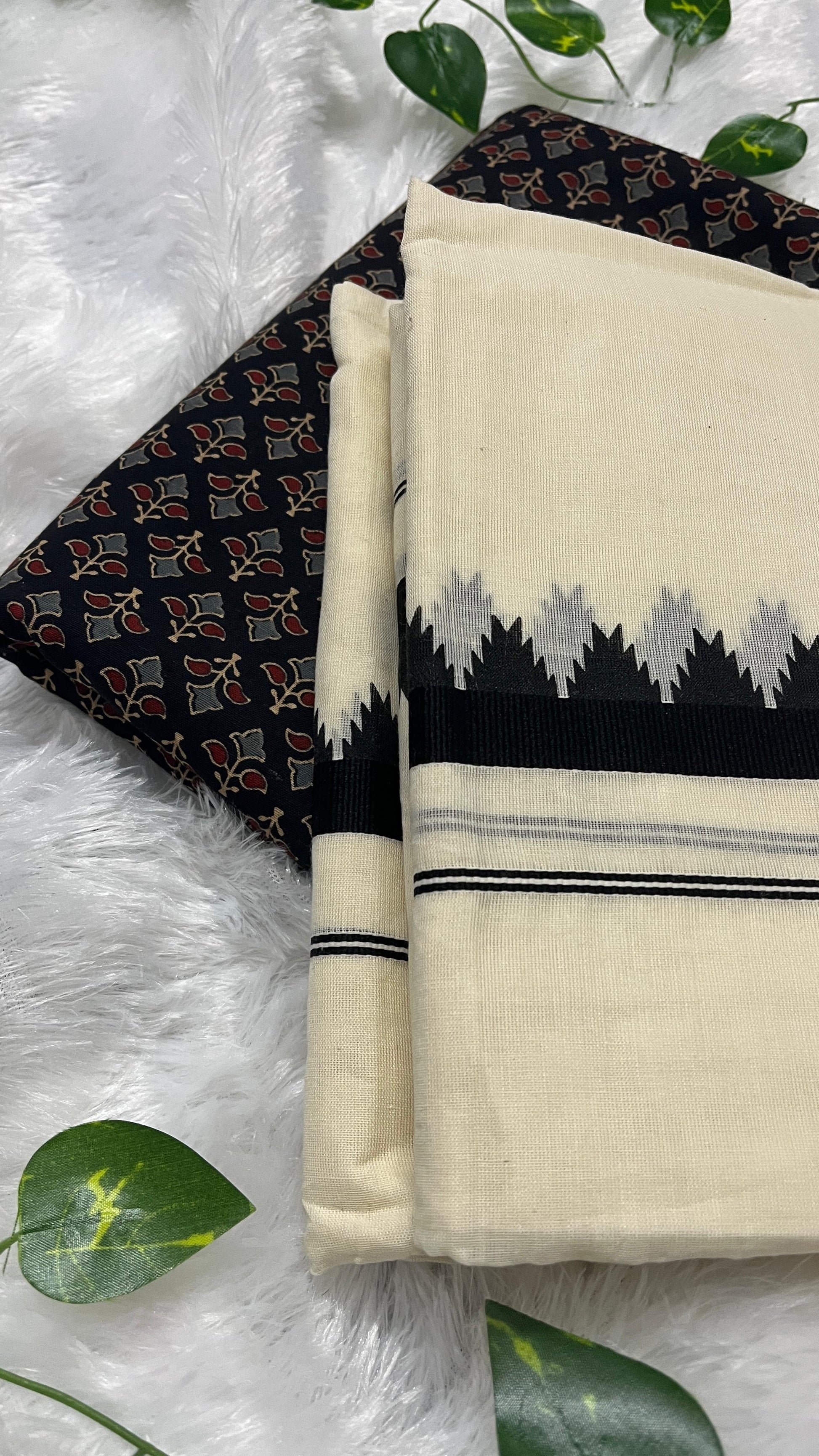 Kerala’s traditional set mundu with the bold grace of a classic black temple border. Woven in fine cotton, this two-piece drape is minimal yet powerful—perfect for those who love understated tradition with a hint of depth and mystery.