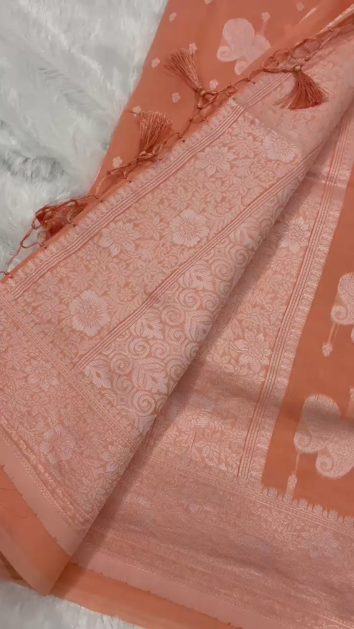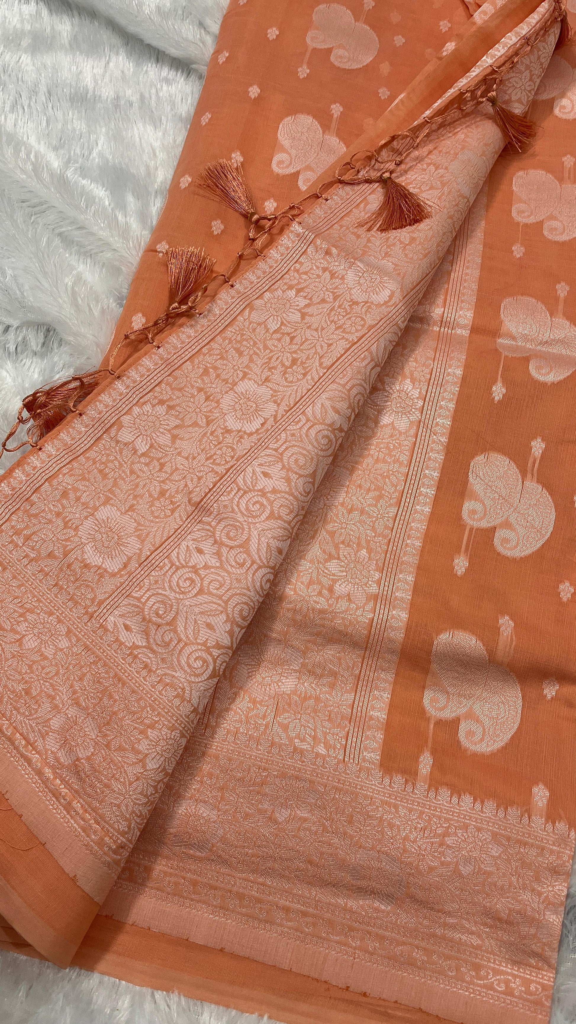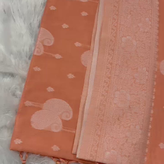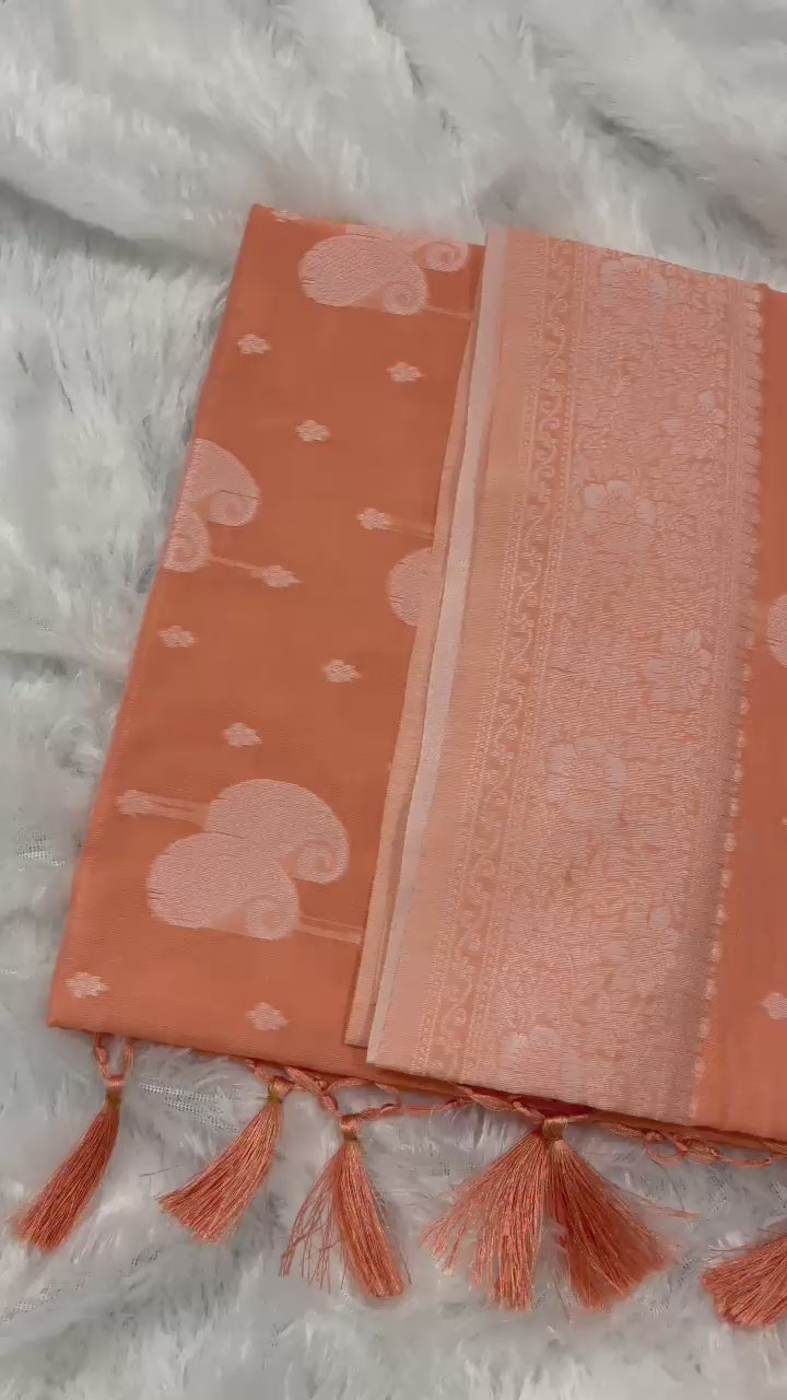 Introducing Kunkuma Thuni, a soft pastel orange saree handwoven with warmth, grace, and timeless simplicity. The name evokes the tender essence of kumkum – sacred, feminine, and powerful, while the muted pastel hue makes it an elegant pick for both everyday charm and festive flair.