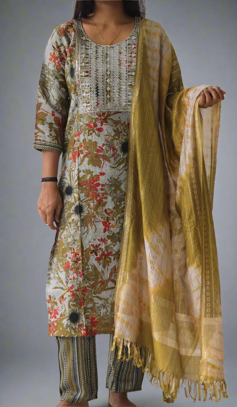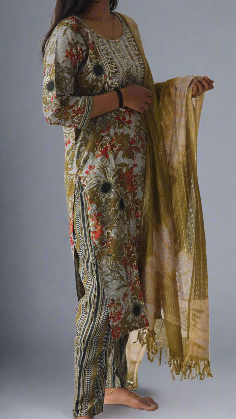 Step into effortless elegance with our Olive Green 3 Piece Set, crafted in breathable cotton for all-day comfort. Designed for the modern woman who loves tradition with a hint of contemporary charm.