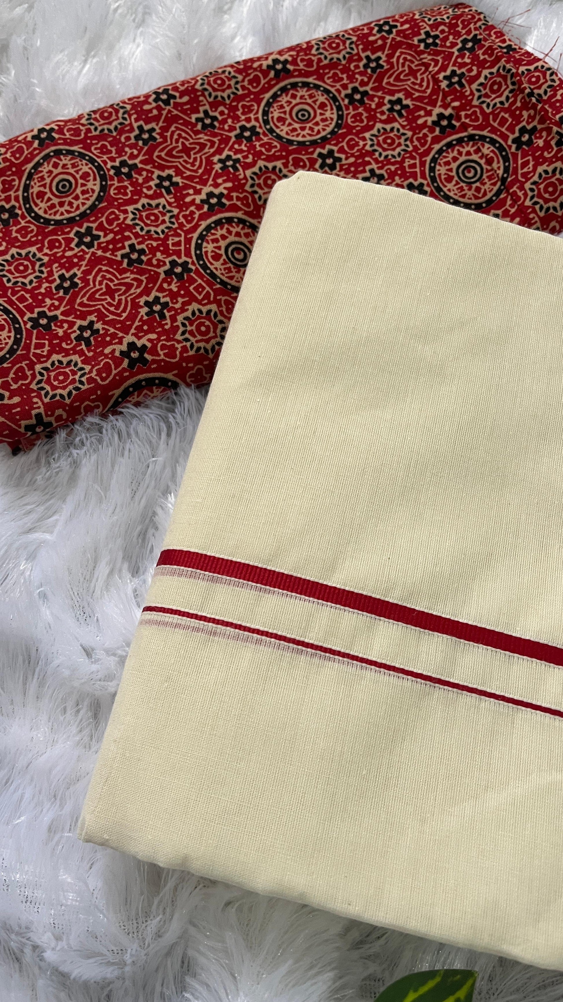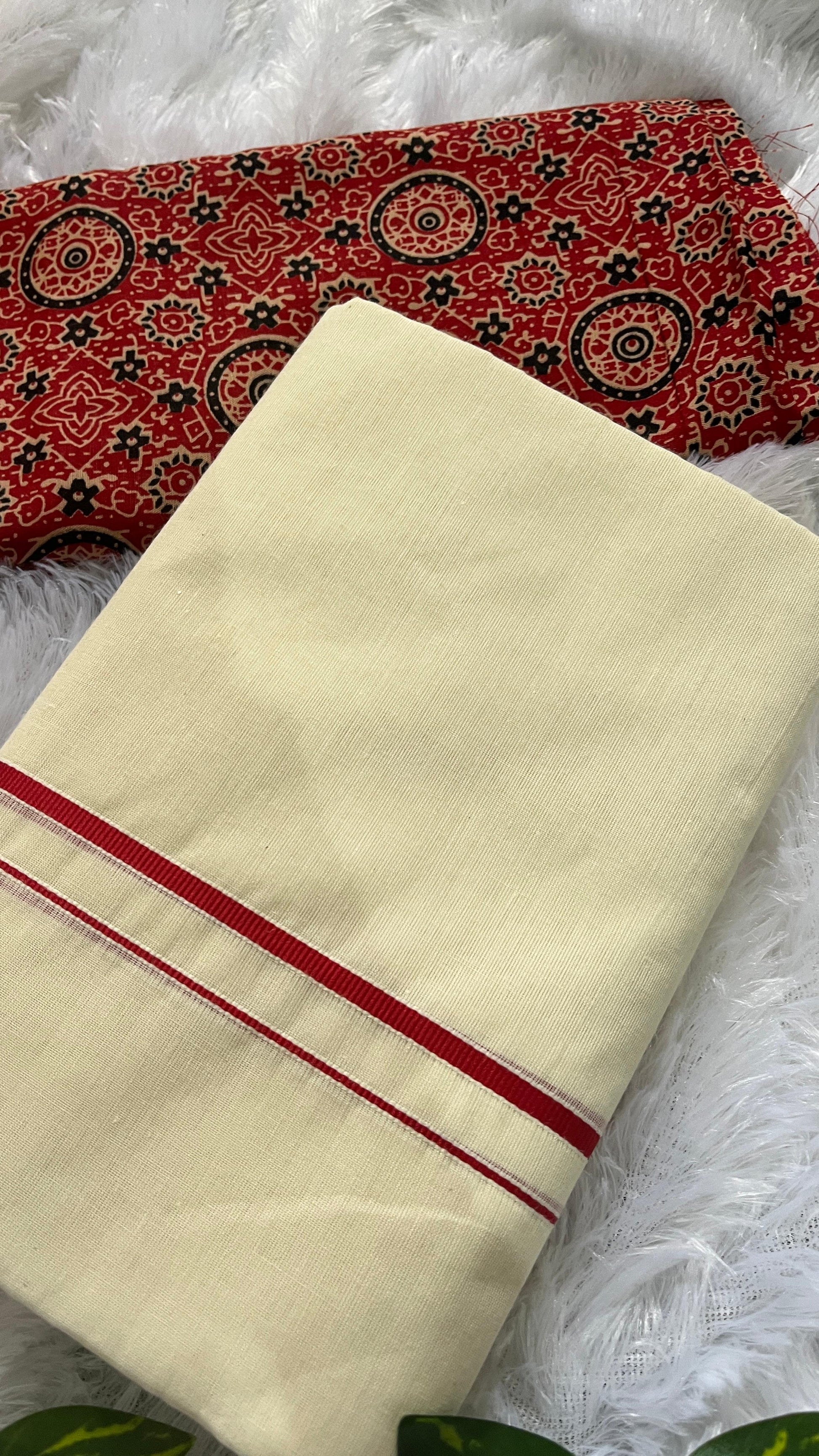 A timeless Kerala set mund with a striking red border, blending tradition with elegance. Crafted from soft, breathable cotton
