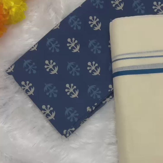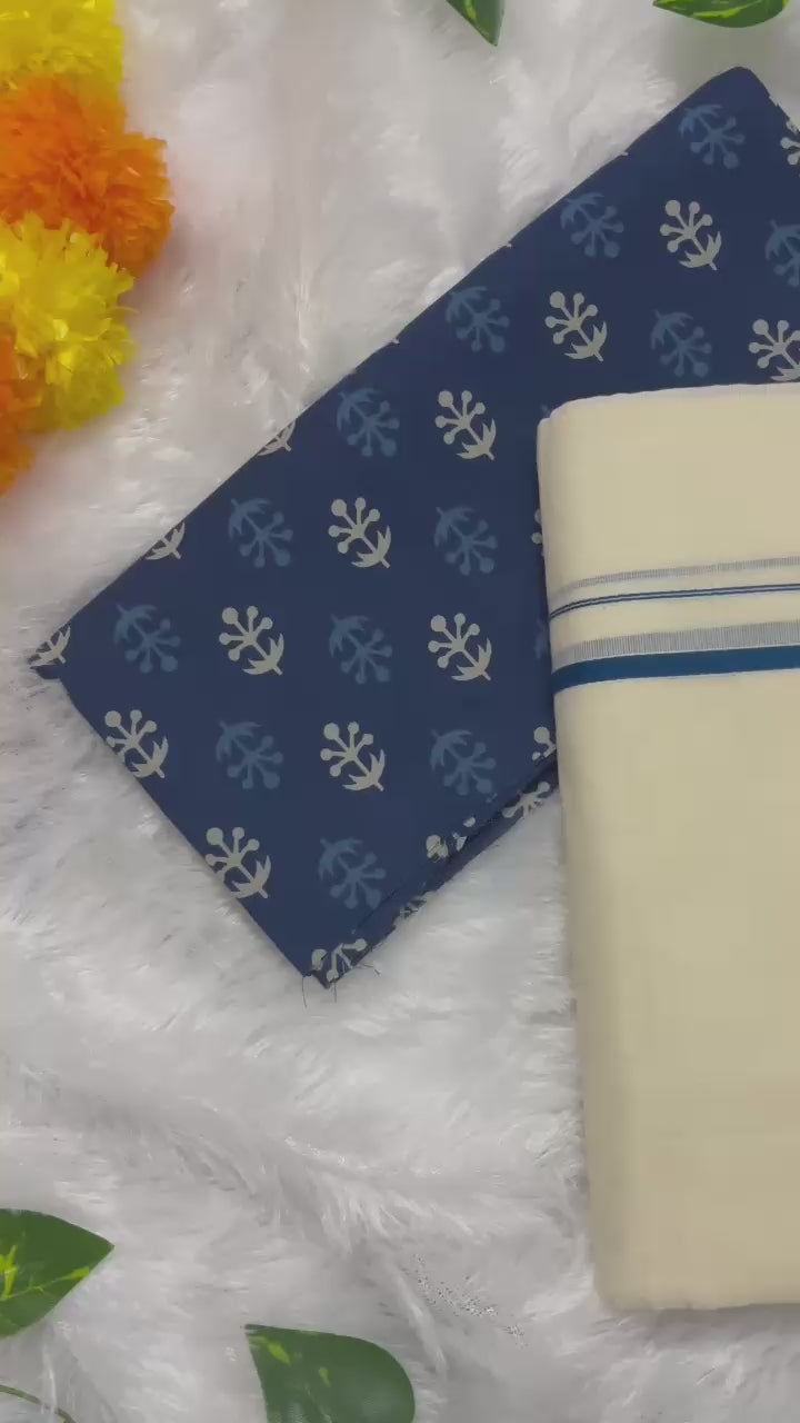 Puliyilakara draws its name from the earthy hues of tamarind leaves and the rich depth of Kerala’s timeless handloom tradition. This beautiful set mundu features a soft off-white cotton body, paired with a bold blue border and comes with a matching blouse piece—offering a complete, ready-to-style ethnic look.