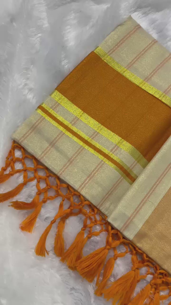 A classic Kerala tissue saree with vibrant orange borders – as precious and bright as a gem.