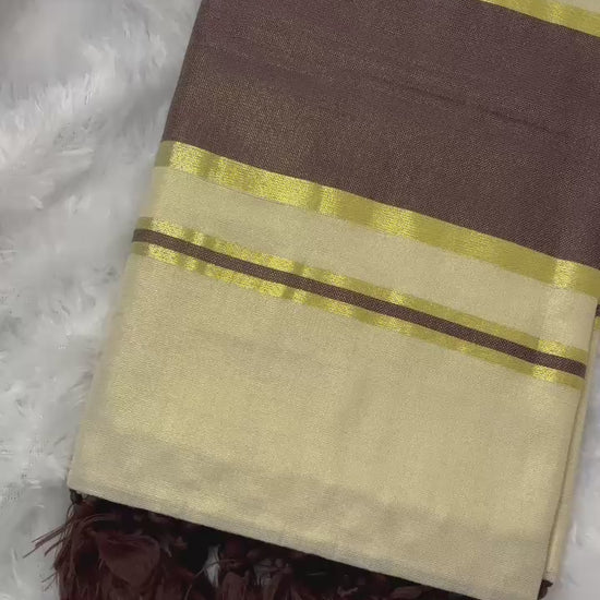 This saree carries the classic grace of Kerala kasavu while introducing a subtle earthy tone that’s perfect for those who prefer understated elegance.